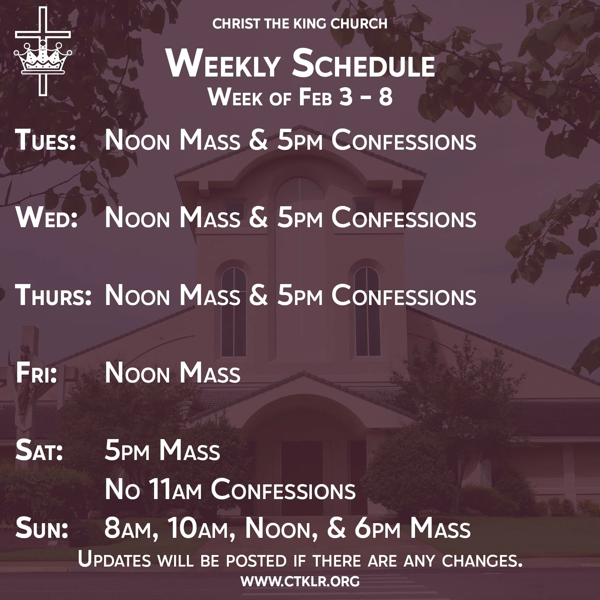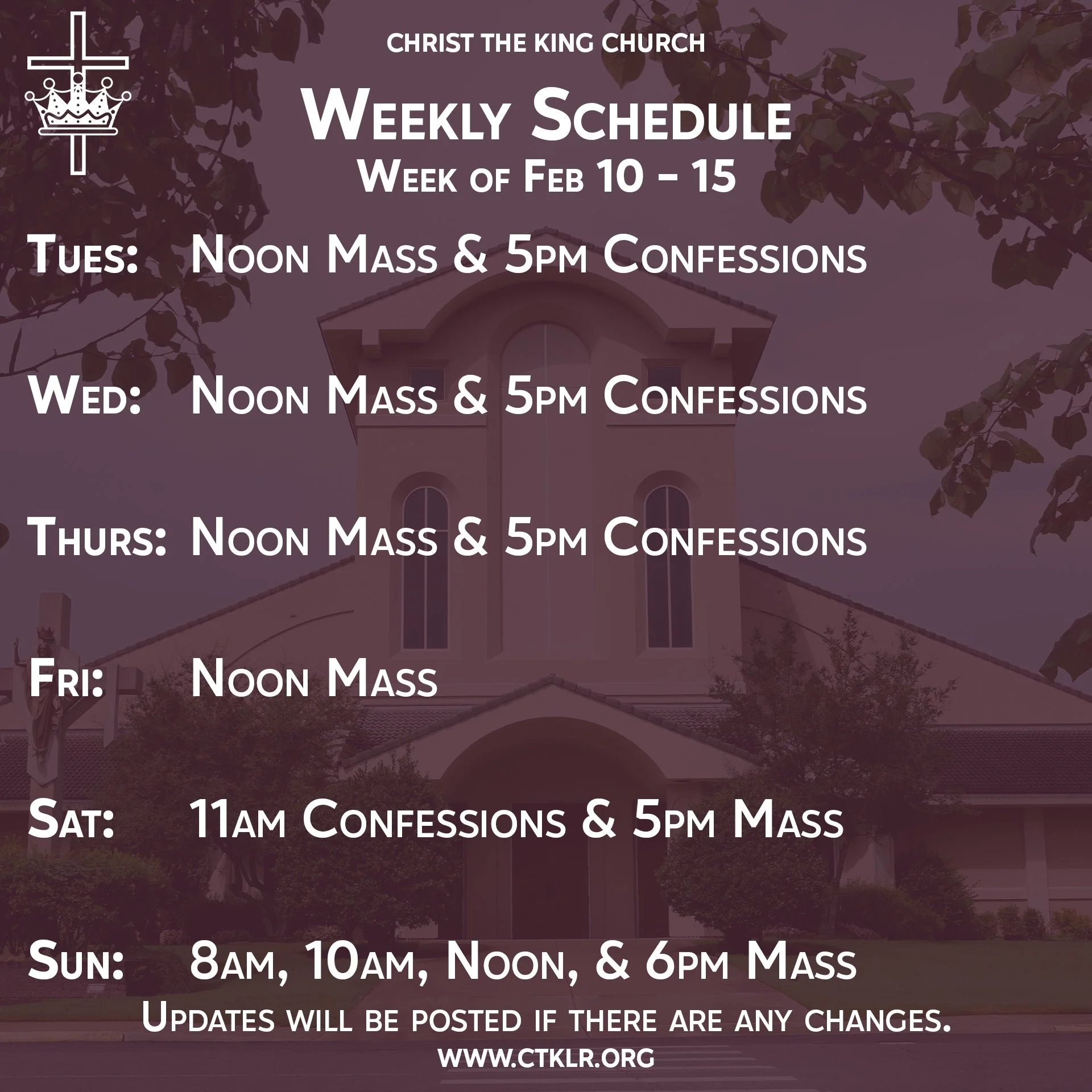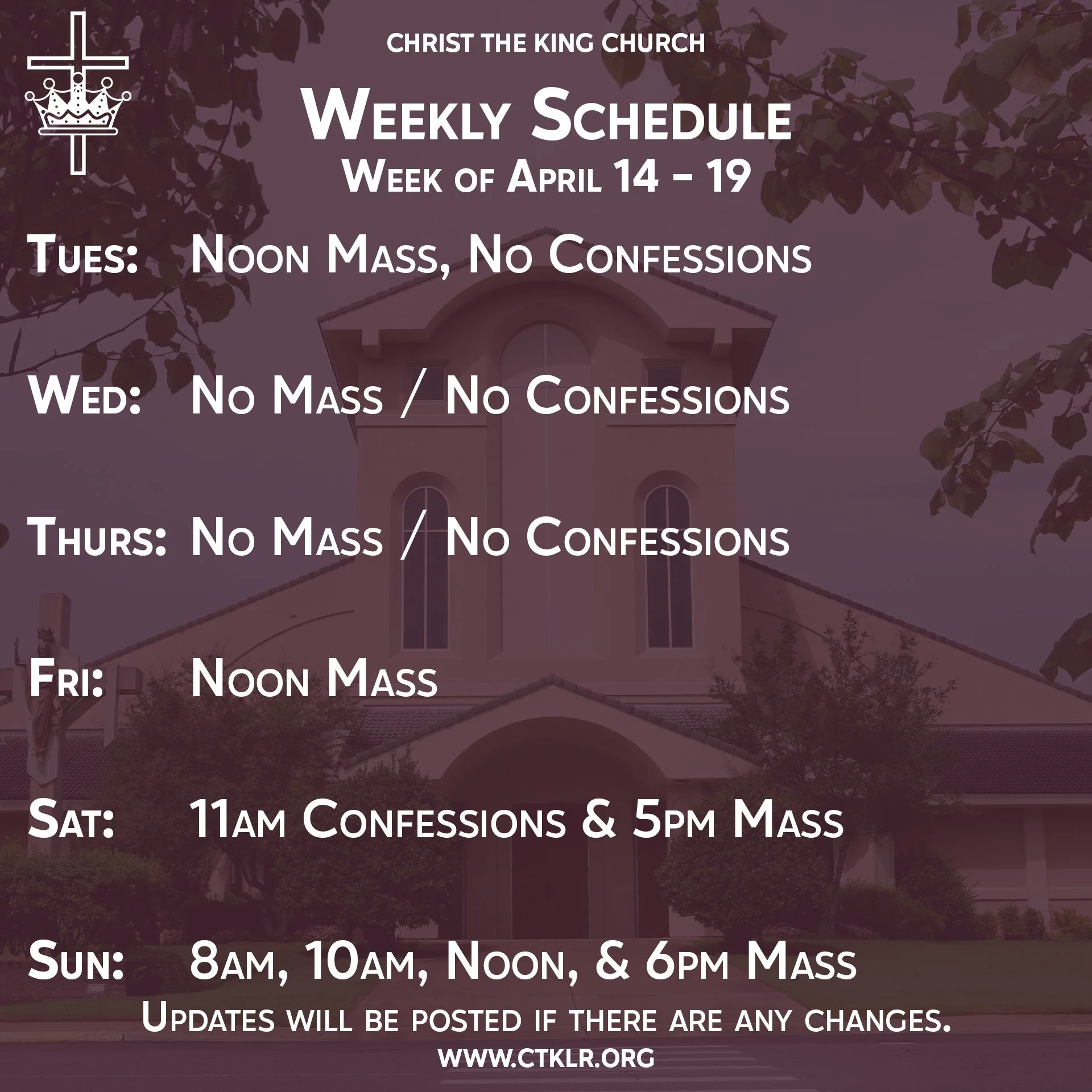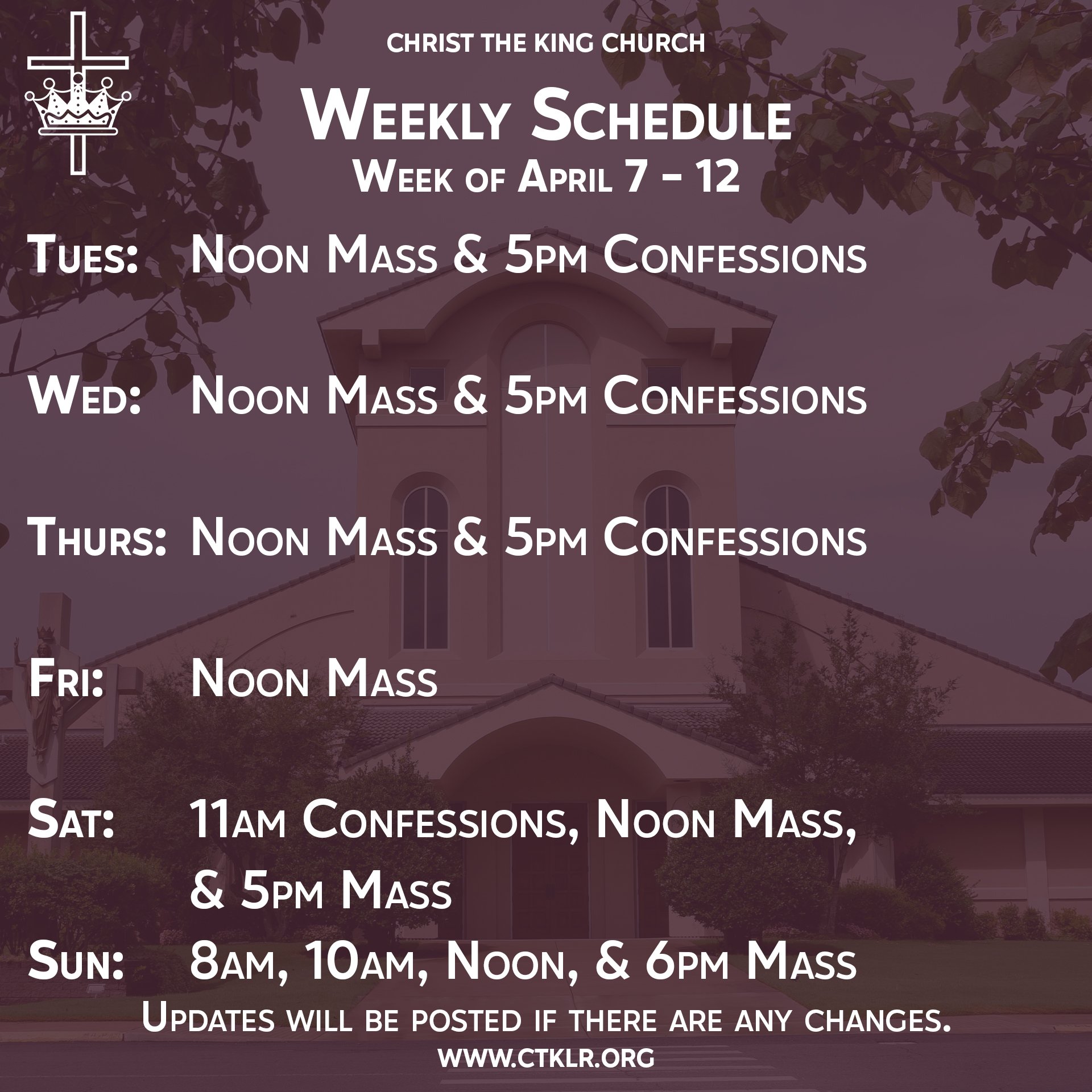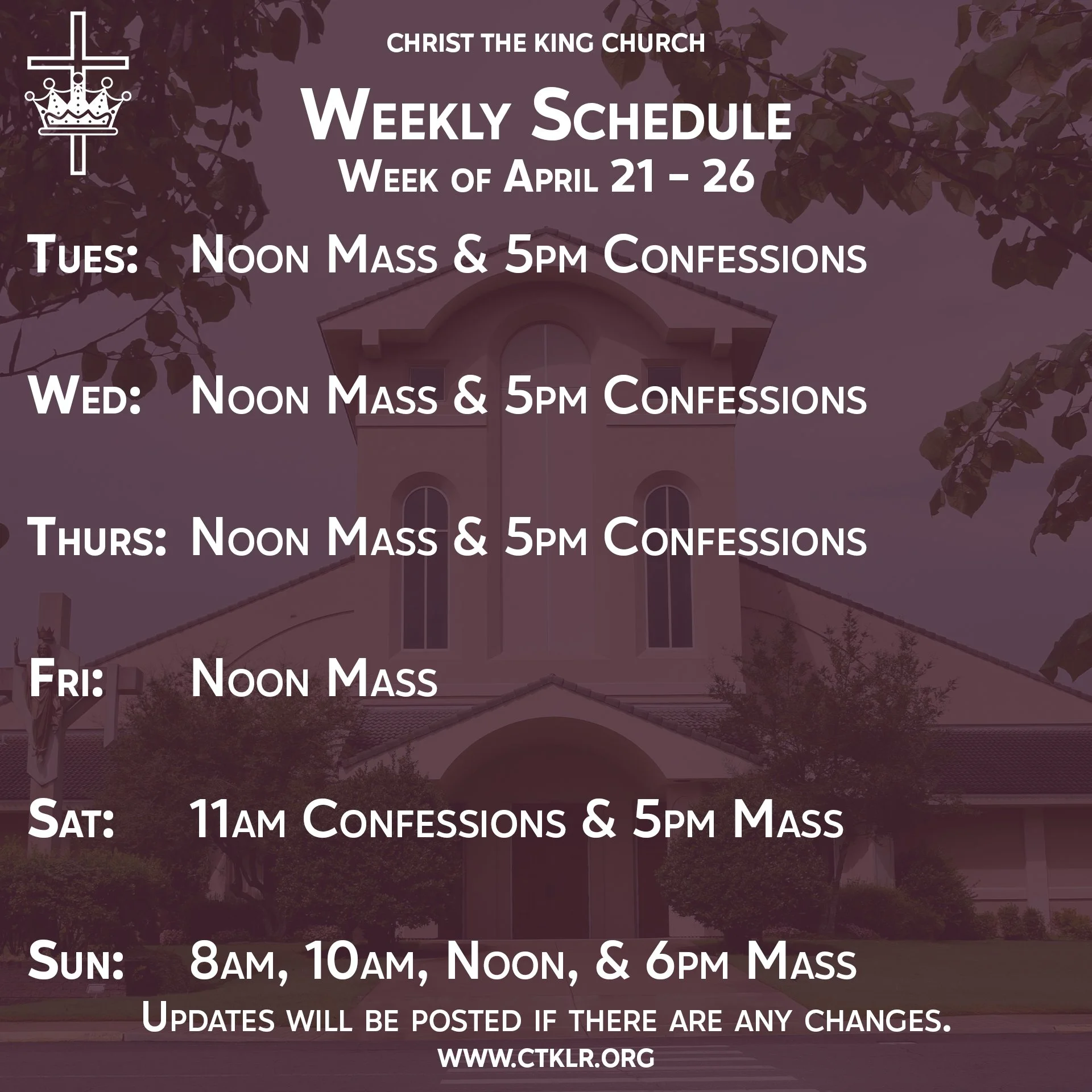 Sun: 8:00am, 10:00am, 12:00 Noon & 6:00pm