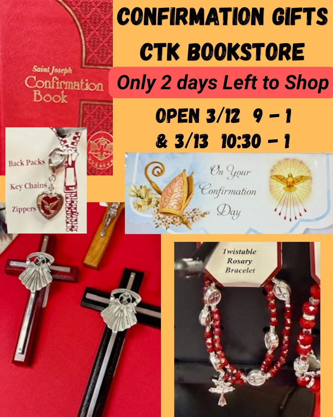 View fullsize Confirmation is Saturday March 14th! There's still time to shop for the perfect gift at the CTK Bookstore. Open Thursday 3/12 from 9-1 and Friday 3/13 from 10:30-1.